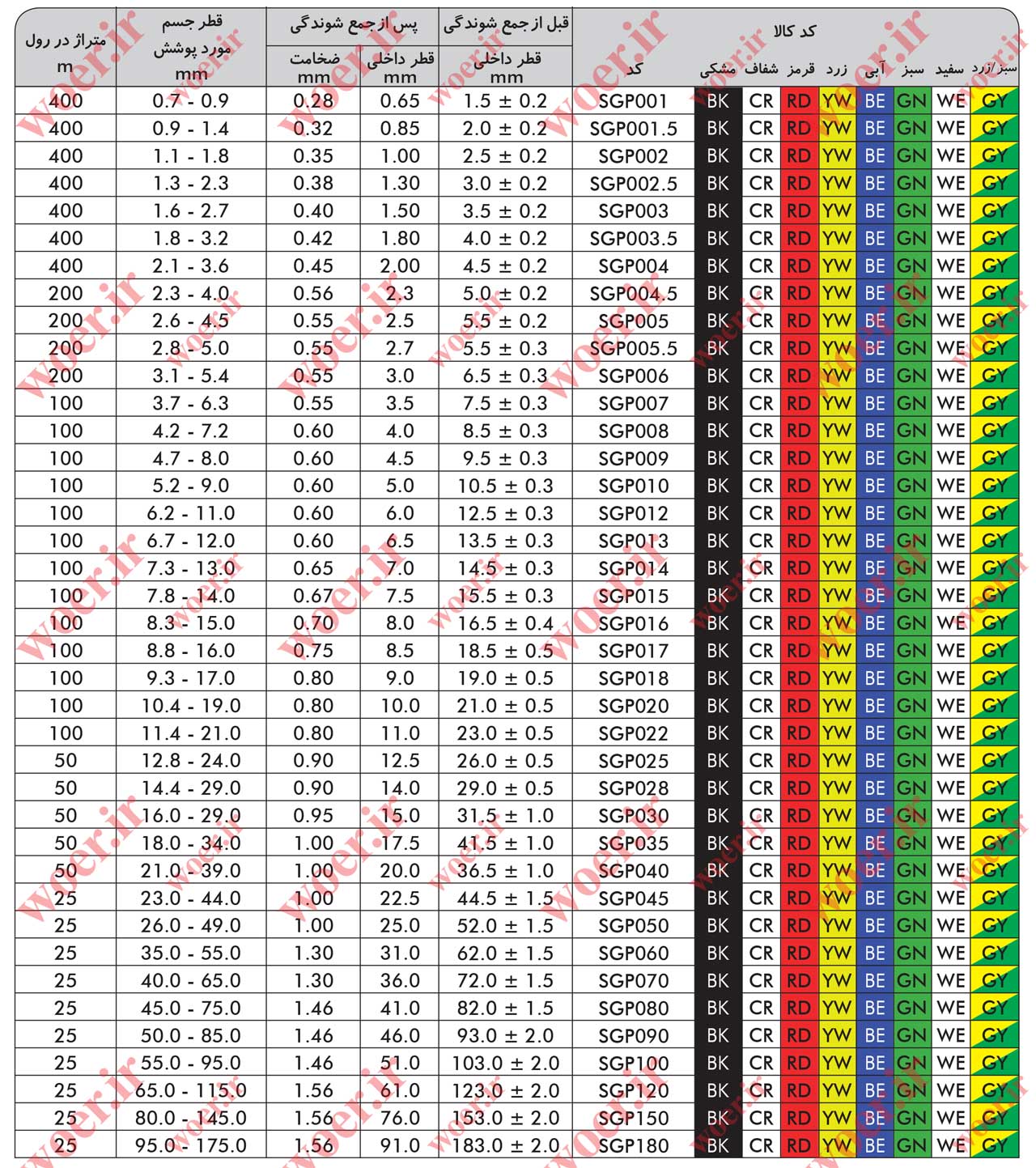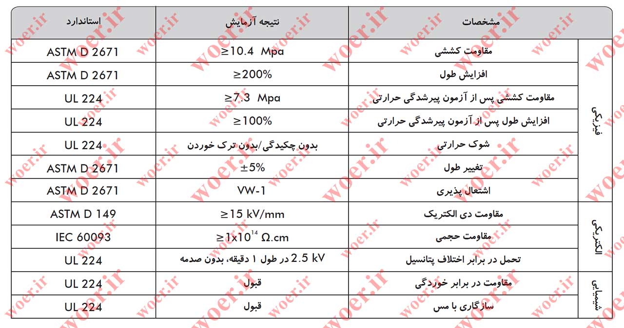 - ماده تشکیل دهنده: پلی الفین انعطاف پذیر، ضد شعله، خود خاموش شونده، پیوند-متقابل (“کراس لینک”) شده